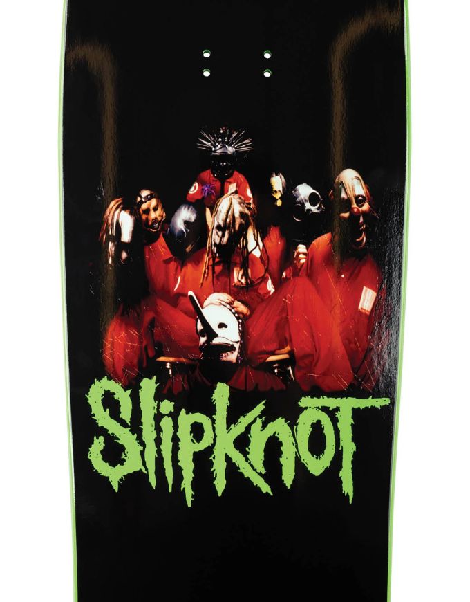 Graphic: Black top and bottom with neon green dipped rails; Slipknot self-titled album art on underside; Slipknot logo in slime green on grip side