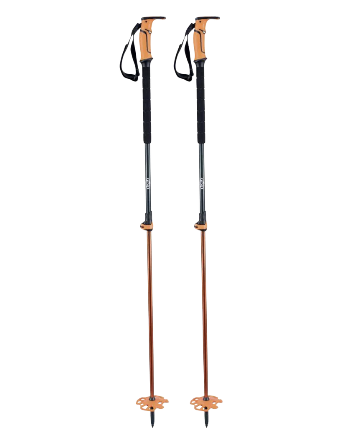 The fixed-length design keeps things simple, strong, and lightweight — eliminating moving parts while delivering dependable performance on the skin track. The ergonomic EVA scraper grip allows quick edge or topsheet scraping, while the steel tip provides solid bite on icy tracks and steep climbs. A large powder basket ensures better flotation when touring in deep snow.