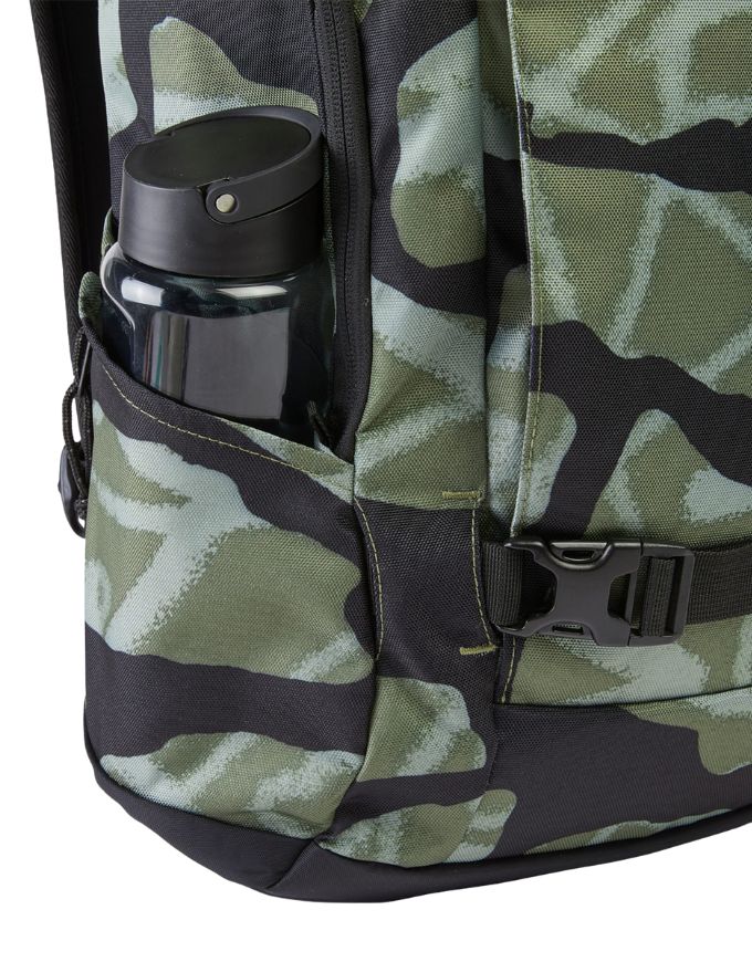 On the outside, the dual webbing straps with buckles secure your skateboard, jacket, or extra layers, while two side water bottle pockets keep hydration close. The fleece-lined accessory pocket protects sunglasses or small electronics, and front zip compartments make quick-grab storage effortless. Comfort is built in with ergonomic shoulder straps, an adjustable sternum strap, and a comfortable Air Mesh back panel designed for all-day wear.